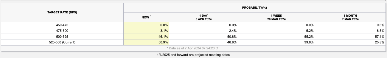 - No rate cuts this year? FED speakers tame rate cuts expectations. The strength of the economy, couple with sticky inflation, is seen as a reason for the FED to hold back on cutting rates. The June rate cut odds have fallen, from 57% a month ago, to the current 46%. The odds for keeping rates unchanged has risen to 51% from 26%. Risk free bonds are likely to underperform in this environment.