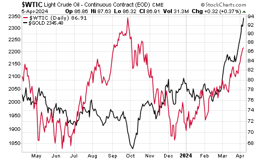 - Oil and gold prices heading higher. Is it a cause for concern? Two key commodities that are influenced by geopolitics have surged in recent weeks. West Texas crude is approaching $90/bbl while gold is hitting $2350. It should be noted that during this period, the US dollar index did not decline, indicating true strength in the oil and gold rally. The potential for Israel-Iran conflict should be seen as a trigger for supply disruption while the pick up in manufacturing could see demand going up in the next few quarters. The all important question is if this would translate to higher inflation.