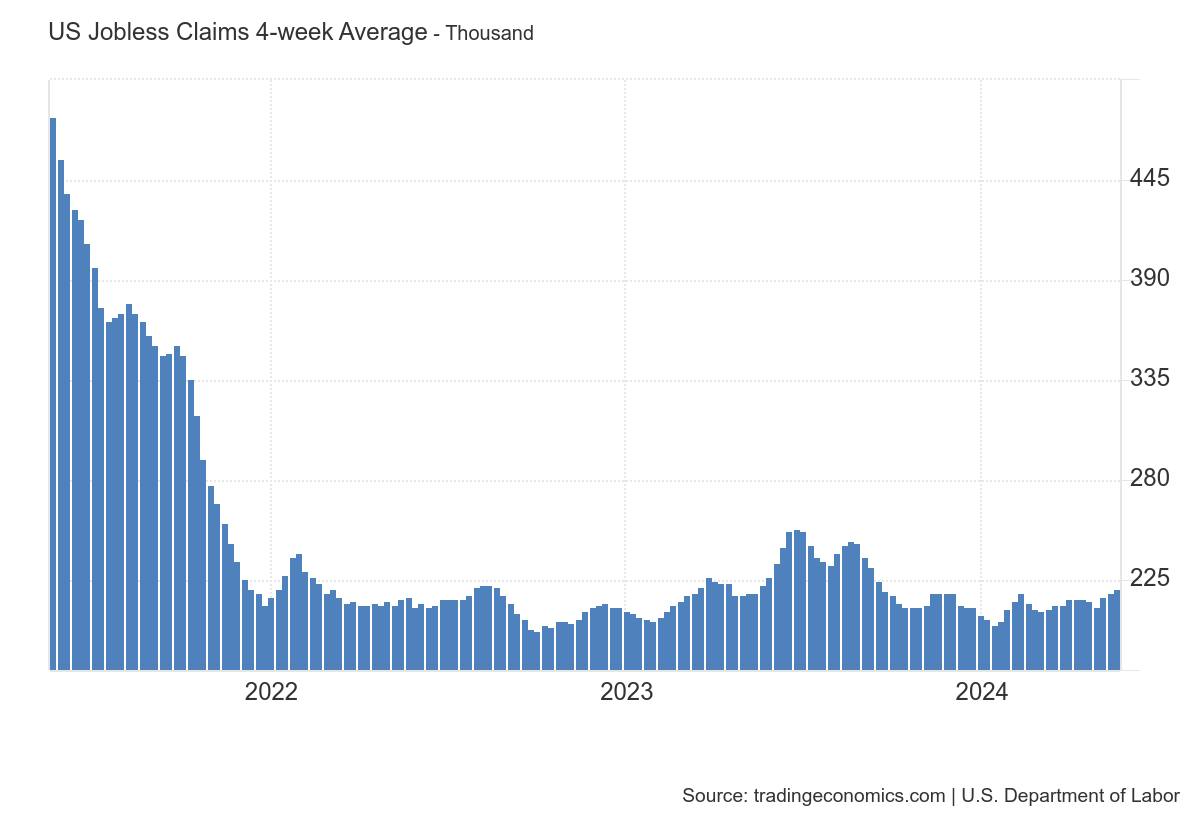 US labour market: some initial signs of stress creeping up in jobless claims. The 4-week moving average is inching up, albeit very slowly. While not a concern currently, investors should watch it very carefully to get a sense of whether the labour market finally breaks down due to high interest rates.