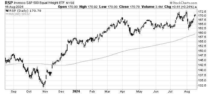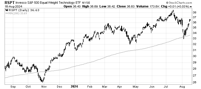 Against the bearish predictions, the US stock market is back. Looking at it from an equal weighted perspective, to strip out the effects from the mega-cap stocks, we see US stocks recovering from their Aug 2nd and 5th sell off. Even technology stocks, where AI remains a divisive conversation, has staged a strong recovery.