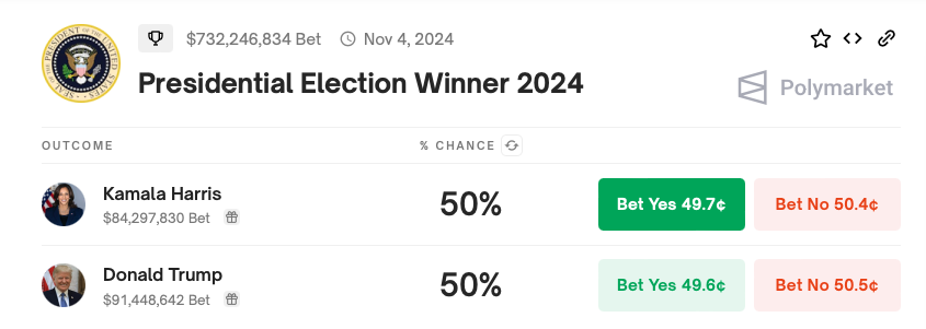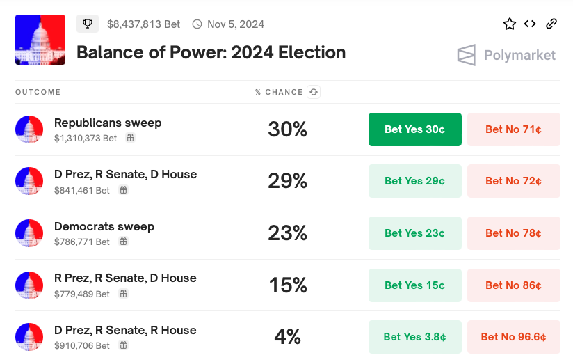 Still in the early stages of the presidential campaign, so the impact on markets is likely to be limited. Prediction market is still split on who will be the next President. There is also no clear winner on who will control the government (which is a good thing!).
