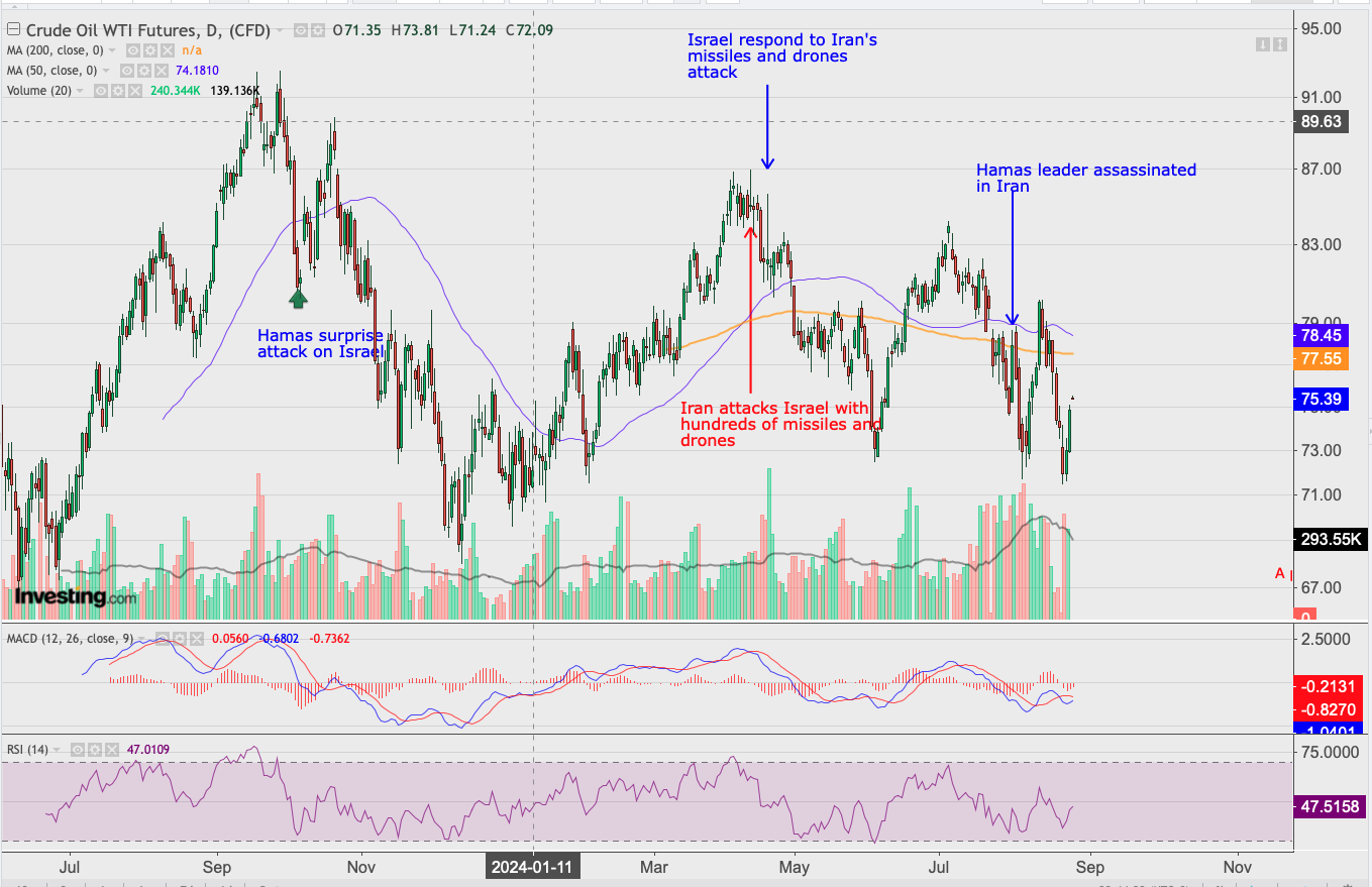 Someone made a move on Sunday. Hezbollah launched hundreds of rockets and drones at Israel early on Sunday, and Israel’s military struck Lebanon with around 100 jets to thwart a larger attack. The two sides have exchanged messages that neither wants to escalate further, with the main gist being that the exchange was “done”, two diplomats told Reuters. More important is the reaction of oil prices. Brent crude futures climbed 37 cents, or 0.5%, to $79.39 a barrel by 2300 GMT while U.S. crude futures were at $75.19 a barrel, up 36 cents, or 0.5%. Again, not much of a reaction from oil markets. Investors can keep calm and carry on, for now.