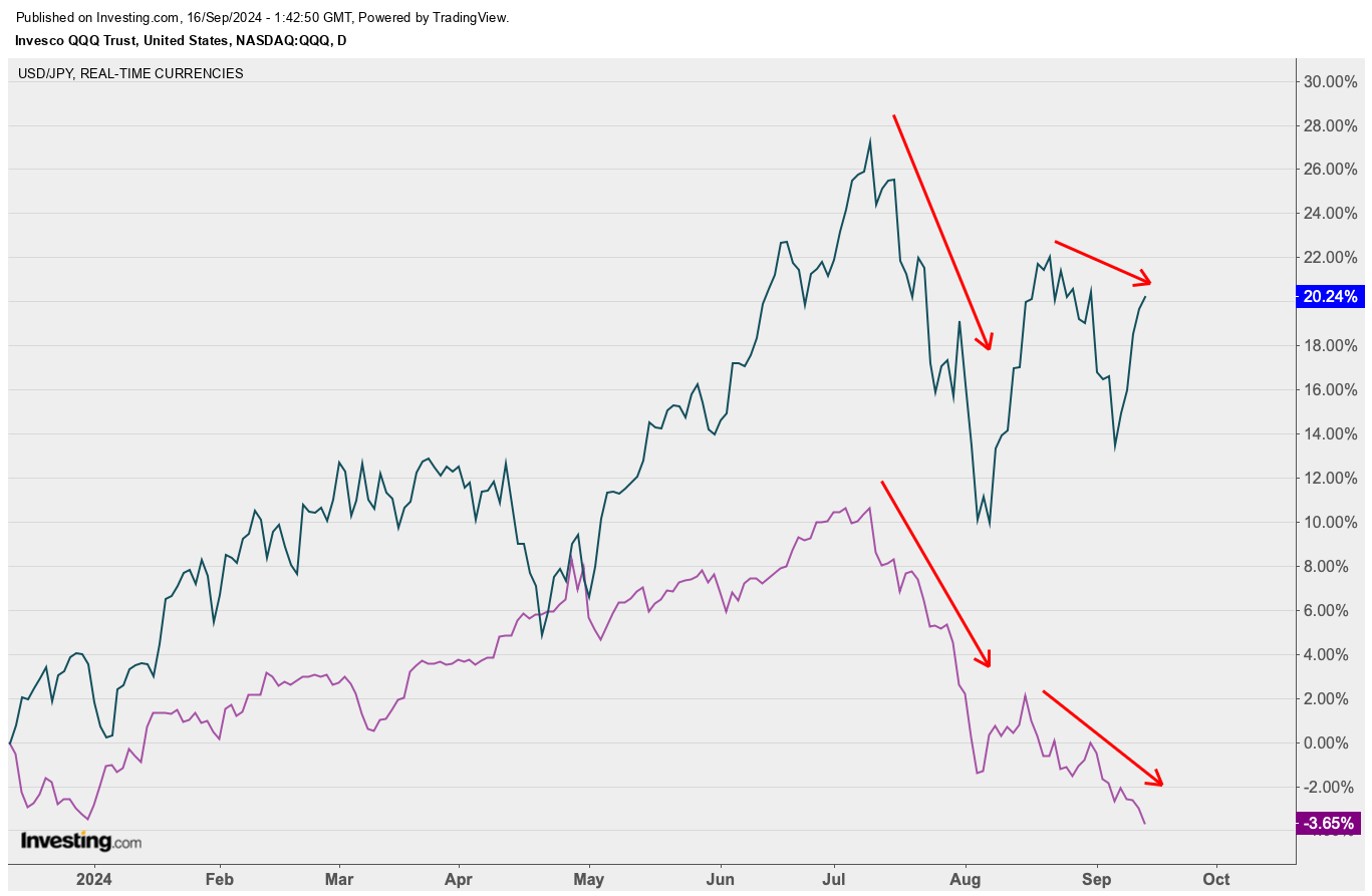 Based on the price action of the largest technology stocks in US markets, and the performance of the USDJPY, it seems to indicate that the effect of the carry trade reversal is diminishing. Since mid-August, the JPY has strengthened again, making new highs against the USD (it’s inverse on the chart). However the QQQ, which tracked the top 100 stocks on Nasdaq, staged a strong rebound to recover much of the losses. Either much of the trade has been unwound, or the thesis was not solid in the first place, i.e. investors did not borrow free JPY to invest in tech stocks.