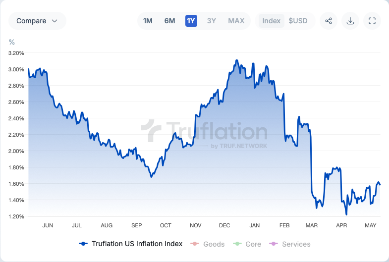 At its May 6–7, 2025 meeting, the Federal Reserve’s Federal Open Market Committee (FOMC) decided to maintain the federal funds rate at 4.25% to 4.5%. This marks the third consecutive meeting where rates have remained unchanged, reflecting the Fed’s cautious approach amid economic uncertainties. Market reactions to the Fed’s decision were mixed. While some investors were reassured by the Fed’s commitment to data-driven policy, others expressed concerns about the potential for stagflation—a scenario characterised by high inflation and stagnant economic growth. Interestingly, Truflation is suggesting that inflation has fallen substantially.