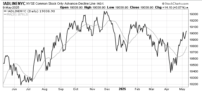 Buyers are still winning for now as the good news continue to roll in, with the US-UK trade deal, resilient US labour market, and less negative outcome for US-China trade talks. Advance-Decline index continues to improve,