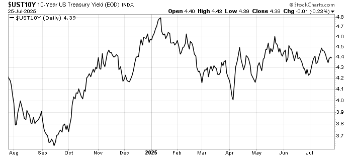 US Treasury bond yields have stabilized over the past month, with the 10-year yield at 4.39% and the 30-year at 4.93% as of July 25, 2025, showing minimal fluctuations. This follows a period of volatility driven by policy uncertainty and tariff announcements. Stabilization is attributed to a resilient economy, with steady labor market data reducing expectations for Federal Reserve rate cuts. Mixed foreign demand for Treasuries, coupled with sufficient interest at current yield levels, supports market balance. Concerns over rising government debt and potential inflation from tariffs have eased, though investors remain cautious. The Fed’s focus on anchoring inflation near 2% further contributes to this stability. While short-term yields are influenced by Fed policy, longer-term yields reflect expectations of sustained economic growth and moderate inflation.
