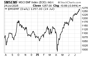 With tariff uncertainty fading, investors are bidding up equities as confidence returns. US, Japan, UK, and EM stocks are making new highs. With global monetary policy easing slightly (with only the FED holding out for now), the outlook continues to improve.