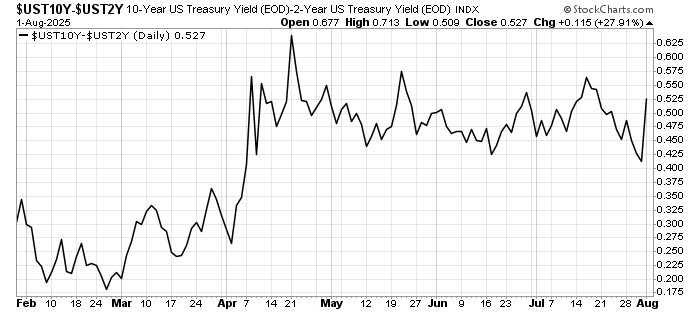 - No Yield Curve Inversion: The difference between the 10-year and 2-year yields rose despite the worse than expected data. Markets are expecting the Fed to cut rates while assuming no recession.