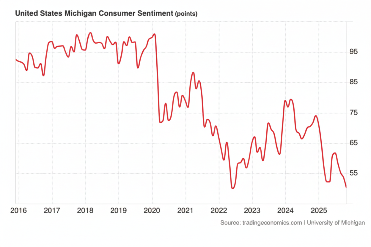 The University of Michigan consumer sentiment index fell to 50.3 in November, down from the previous month 53.6. The drop comes as the US federal government shutdown drags on, heightening household anxiety.