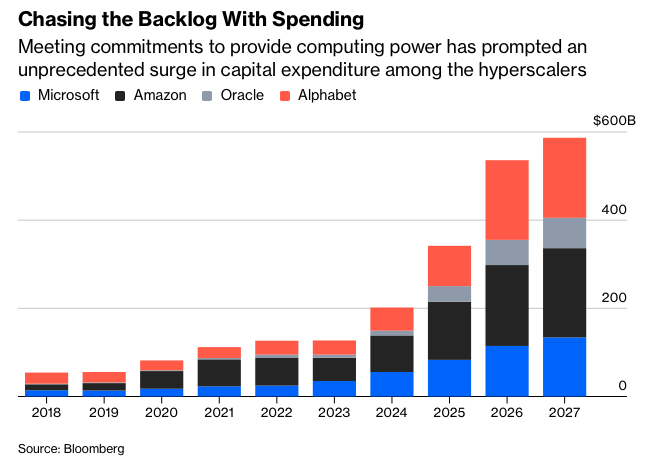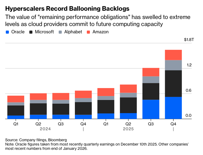 Based on Q4 results, the AI Hyperscalers’ backlog continues to grow. Microsoft and Oracle are the leaders. Their fortunes are increasingly tied to OpenAI. Profits need to catch up with investments eventually, if their stock prices are to continue going up. Currently, the big spenders are seeing their stock prices drop.